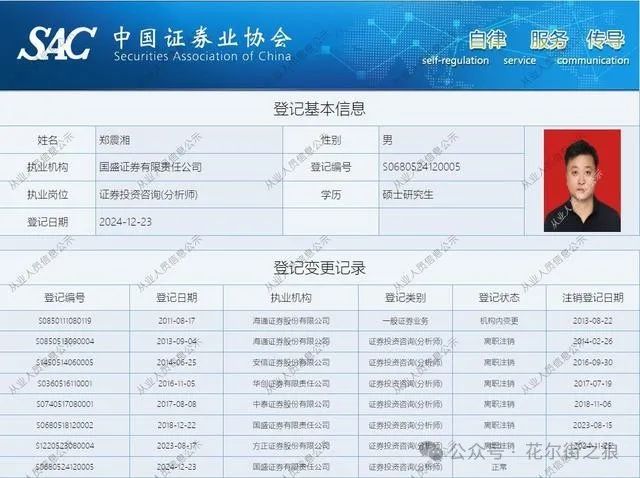 中国证券业协会官网贵府流露,2024年11月25日,郑震湘在耿直证券的登记情状变更为去职刊出。2024年12月23日,郑震湘捏业机构再行变更为国盛证券,捏业岗亭为证券投资操办(分析师)。